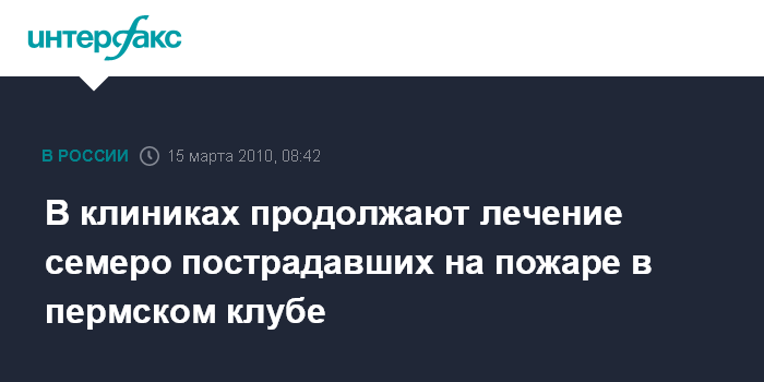 Москва. 15 марта. INTERFAX.RU - Больницы Москвы и Перми покинули еще двое пострадавших на пожаре в пермском клубе "Хромая лошадь".