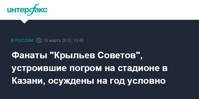Москва. 15 марта. INTERFAX.RU - Мировой суд Вахитовского района Казани признал виновными в групповом вандализме пятерых жителей Самарской области - болельщиков самарского футбольного клуба "Крылья Советов", повредивших имущество Центрального стадиона во время одного из матчей.