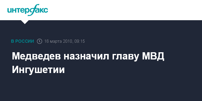 Москва. 16 марта. INTERFAX.RU – Президент России Дмитрий Медведев подписал указ о назначении генерал-майора милиции Виктора Поголова министром внутренних дел по Республике Ингушетия, освободив его от занимаемой должности, сообщила во вторник пресс-служба главы государства.