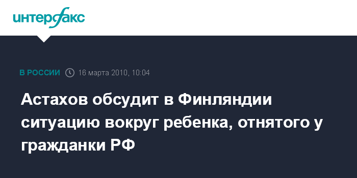 Москва. 15 марта. INTERFAX.RU - Уполномоченный по правам ребенка в РФ Павел Астахов во вторник прибывает в Финляндию, где проведет встречи с уполномоченным по правам ребенка в Финляндии Марией Кайса Аула, россиянкой Ингой Рантала и ее сыном Робертом. "16 марта в 15 часов уполномоченный по правам ребенка при президенте РФ в Хельсинки встретится с министром юстиции Финляндии Туйей Бракс. В 16:30 у Астахова намечена встреча с финским коллегой Марией Кайса Аула", - сообщил представитель пресс-службы Астахова. Он отметил, что 17 марта уполномоченный посетит город Турку, где встретится с россиянкой Ингой Рантала и ее сыном Робертом, а также представителями органов опеки.