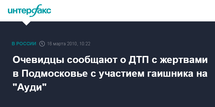 Москва. 16 марта. INTERFAX.RU - Один из очевидцев аварии на Ленинском проспекте с участием служебной автомашины НК "ЛУКОЙЛ" стал свидетелем еще одного трагического столкновения машин в Подмосковье, за рулем одной из которых находился сотрудник ГИБДД, заявляют в Федерации автовладельцев России (ФАР). "Вчера около 20:00 один из очевидцев ДТП в районе Гагаринской площади, проезжая по Киевскому шоссе в районе Наро-Фоминска (80-й километр) увидел, как с противоположной полосы через двойную сплошную линию навстречу вылетела "Ауди А6", - сказал "Интерфаксу" во вторник лидер московского отделения ФАР Сергей Канаев. По его словам, увидев опасность, очевидец "стал уводить свою машину вправо, и в это время произошло лобовое столкновение "Ауди" и ВАЗ-2104, идущей впереди него, на обоюдной скорости не менее 80 км в час".