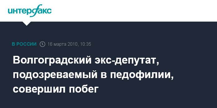 Москва. 16 марта. INTERFAX.RU - Депутат Волгоградской областной думы предыдущего созыва, ныне бизнесмен Николай Волков, задержанный в понедельник по подозрению в совершении нескольких преступлений против детей, скрылся и объявлен в федеральный розыск, сообщает пресс-служба СУ СКП РФ по области. "15 марта примерно в 19:40 после проведения осмотра места происшествия, при доставлении оперативными сотрудниками подозреваемого Н.Волкова в помещение следственного управления для выполнения следственных действий он совершил побег", - сказано в пресс-релизе. В этот же день Волков был объявлен в федеральный розыск. Во вторник по факту побега подозреваемого возбуждено уголовное дело по ст.313 УК РФ.