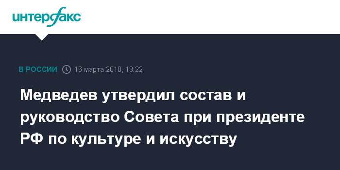 Москва. 16 марта. INTERFAX.RU - Президент России Дмитрий Медведев подписал указ "Об утверждении состава Совета при президенте РФ по культуре и искусству", сообщает пресс-служба главы государства во вторник. Также президент подписал распоряжение "Об утверждении состава президиума Совета при президенте РФ по культуре и искусству".