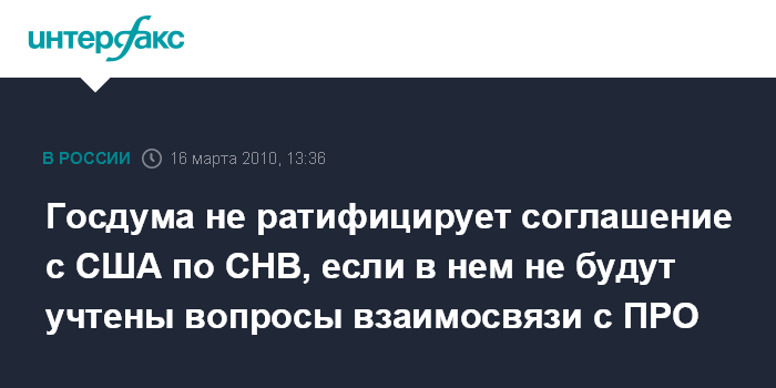 Госдума не ратифицирует соглашение с США по СНВ, если в нем не будут учтены вопросы взаимосвязи с ПРО