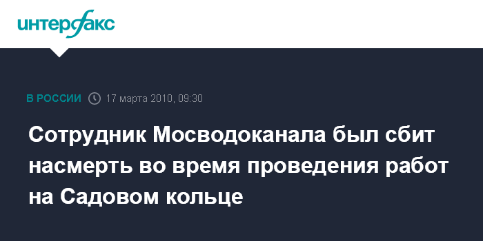 Москва. 17 марта. INTERFAX.RU - Легковой автомобиль насмерть сбил сотрудника Мосводоканала во время работ на Садовом кольце, сообщил "Интерфаксу" в среду источник в правоохранительных органах столицы. "В ночь на среду около 3:50 на Земляном валу у дома 18 трое рабочих Мосводоканала под руководством мастера завершали работы. Когда рабочие уже убирали предупредительные знаки в служебную машину, водитель легковой автомашины "Nissan" сбил одного из них, припечатав к автомашине "Бычок". Сотрудник Мосводоканала, 33-летний житель Подмосковья, скончался по дороге в больницу", - рассказал собеседник агентства, добавив, что у него осталось двое детей 9 и 12 лет.