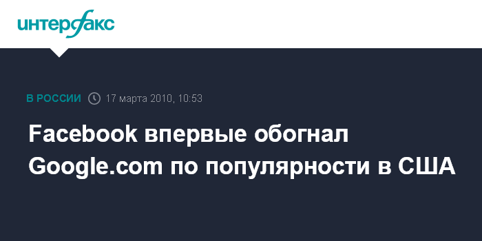 Москва. 17 марта. INTERFAX.RU - Сайт социальной сети Facebook на минувшей неделе впервые в своей истории обогнал по посещаемости самый популярный интернет-поисковик Google.com, пишет газета Financial Times со ссылкой на данные исследовательской фирмы Hitwise. На прошлой неделе 7,07% всех посещений Интернета американскими пользователями пришлось на страницу Facebook, в то время как только 7,03% американцев, вышедших во всемирную сеть, зашли на страницу Google.