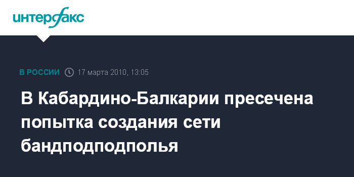 Москва. 17 марта. INTERFAX.RU - На территории Кабардино-Балкарии выявлена сеть, которую пытались сформировать члены бандподполья, сообщил глава МВД по КБР Юрий Томчак. "Задержаны 12 пособников членов незаконных вооруженных формирований", - сказал Ю.Томчак в среду на оперативно-служебном совещании. Он отметил, что сейчас проводится активная оперативно-розыскная и следственная работа, собираются доказательства их противоправной деятельности.