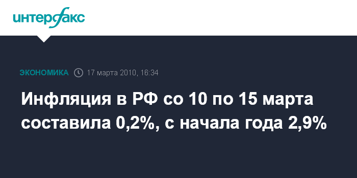 Москва. 17 марта. INTERFAX.RU - Инфляция в РФ с 10 по 15 марта 2010 г. составила 0,2%, с начала года - 2,9%, сообщил в среду Росстат.