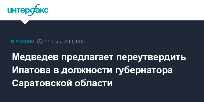 Москва. 17 марта. INTERFAX.RU - Президент России Дмитрий Медведев внес на рассмотрение Саратовской областной Думы кандидатуру Павла Ипатова для наделения его полномочиями губернатора Саратовской области, сообщает в среду пресс-служба Кремля.