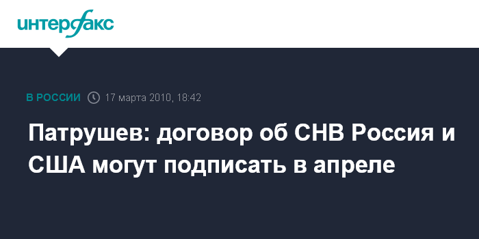 Москва. 17 апреля. INTERFAX.RU - Новый российско-американский договор об СНВ может быть подписан в апреле, сообщил "Интерфаксу" в среду секретарь Совета безопасности РФ Николай Патрушев.