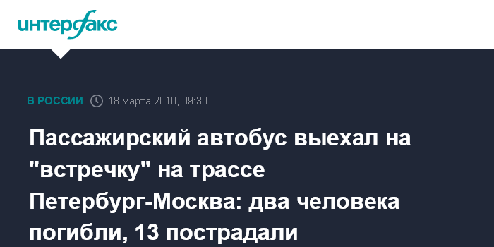 Москва. 18 марта. INTERFAX.RU – ДТП с участием междугороднего пассажирского автобуса произошло на трассе Москва - Санкт-Петербург в Тверской области в четверг около 6 утра, сообщили "Интерфаксу" в региональном управлении ГИБДД.