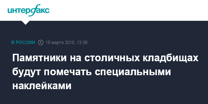 Москва. 18 марта. INTERFAX.RU - Столичные власти вводят на городских кладбищах общемировую практику пометок бесхозных и шатающихся памятников, сообщил заместитель руководителя департамента потребительского рынка и услуг Москвы Алексей Сулоев на пресс-конференции в центральном офисе "Интерфакса" в четверг. "С этого года мы начнем помечать некоторые памятники наклейками двух цветов - красного и зеленого", - сказал Сулоев. Он объяснил, что наклейки зеленого цвета будут размещать на брошенных и бесхозных могилах. Они будут содержать просьбу к владельцам захоронения, если такие объявятся, прийти в администрацию кладбища и показать документы на памятник. Сулоев отметил, что на сегодняшний день получено более 600 заявок от людей, которые хотят взять заброшенные захоронения под опеку.