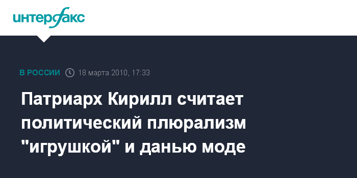 Москва. 18 марта. INTERFAX.RU - Патриарх Московский и всея Руси Кирилл заявил о своем скептическом отношении к идее политического плюрализма. "Не наша, не церковная это идея - политический плюрализм", - заявил патриарх Кирилл в четверг на встрече с преподавателями и студентами Ереванского государственного университета. Патриарх, по его словам, осознает, что подобное заявление может вызвать бурную критику со стороны журналистов. "Но прямо скажу: это все игрушки, дань моде, переживание момента. (Если) сегодня это кажется целесообразным - играем в свои игрушки", - сказал патриарх Кирилл. "Играете - играйте, но кто-то же должен думать о единстве поверх политических партий", - добавил он.