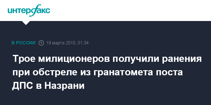 Назрань. 19 марта. ИНТЕРФАКС-ЮГ - В Назрани на федеральной трассе "Кавказ" неизвестные из автоматического оружия и гранатометов обстреляли пост ДПС, ранены трое сотрудников милиции.
