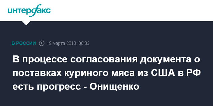 На днях Г.Онищенко сказал "Интерфаксу", что к концу этой недели специалисты России и США планируют подготовить итоговый проект документа, который даст "зеленый" свет возобновлению поставок американского мяса птицы в РФ.