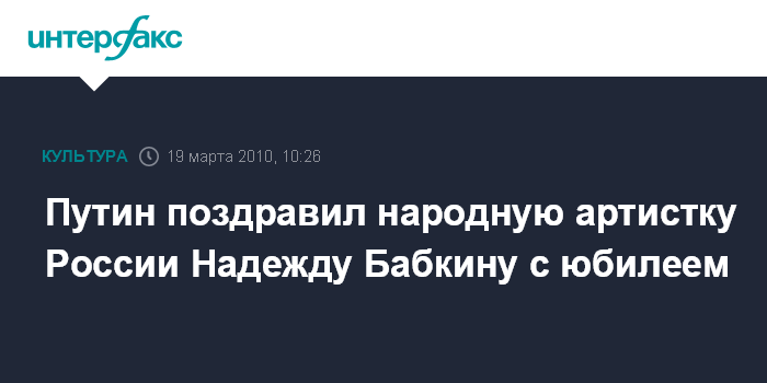 Москва. 19 марта. INTERFAX.RU - Премьер России Владимир Путин поздравил руководителя театра "Русская песня", народную артистку России Надежду Бабкину с юбилеем, сообщает в пятницу пресс-служба правительства РФ.