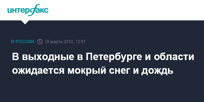 Москва. 19 марта. INTERFAX.RU - Осадки в виде мокрого снега и дождя ожидаются в Петербурге и Ленинградской области в выходные дни, сообщили "Интерфаксу" в городском Гидрометцентре в пятницу. По прогнозу синоптиков, наиболее существенными осадки будут в ночь на субботу. В течение всех выходных сохранится ветер 7-12 м/с.