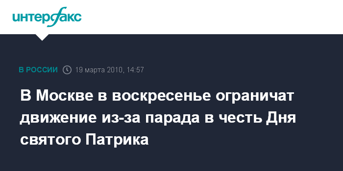 Москва. 19 марта. INTERFAX.RU - Движение автомобилей по набережной Тараса Шевченко в Москве будет ограничено в воскресенье в связи с проведением 21 марта парада, посвященного Дню святого Патрика. Как сообщили "Интерфаксу" в пятницу в отделе пропаганды безопасности дорожного движения УГИБДД Москвы, в связи с мероприятием с 10:30 до 13:30 будет ограничено движение автотранспорта по набережной Тараса Шевченко от гостиницы "Украина" до Бородинского моста и улице Большая Дорогомиловская от Бородинского моста до площади Дорогомиловской заставы. Указанные ограничения в движении будут вводиться по маршруту следования парада.