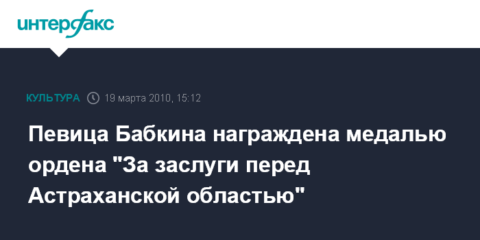 Москва. 19 марта. INTERFAX.RU - Астраханский губернатор Александр Жилкин подписал постановление о награждении народной артистки России Надежды Бабкиной медалью ордена "За заслуги перед Астраханской областью". "Высшей награды региона наша выдающаяся землячка, художественный руководитель ансамбля "Русская песня " удостоена за большой вклад в сохранение и развитие русской народной музыкальной культуры", - сообщает в пятницу пресс-служба губернатора.