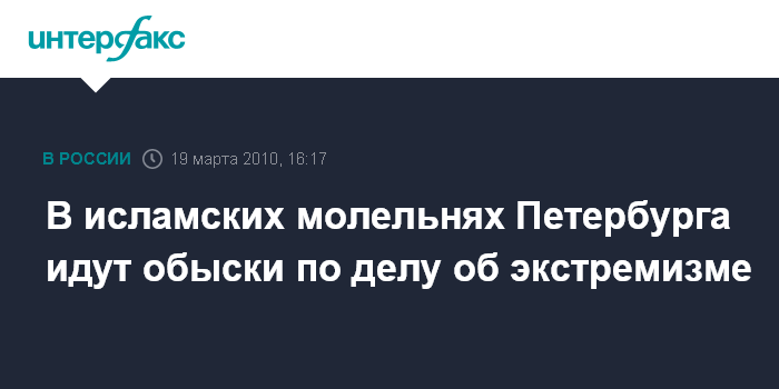 Москва. 19 марта. INTERFAX.RU - Сотрудники правоохранительных органов Петербурга в пятницу проводят обыски в исламских молельных комнатах и мусульманских учреждениях по делу об экстремизме, сообщает сайт Следственного управления СКП РФ по городу. Обыски в ряде исламских заведений, расположенных на территории Петербурга, проводят сотрудники СКП, ФСБ и ГУВД в рамках возбужденного управлением СКП уголовного дела по статье 282 УК РФ (возбуждение ненависти, вражды, а равно унижение человеческого достоинства).