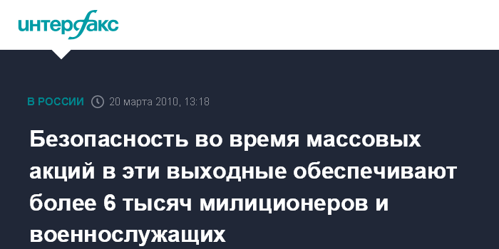 Москва. 20 марта. INTERFAX.RU - Более 5 тысяч сотрудников милиции привлечены для обеспечения правопорядка и общественной безопасности при проведении массовых мероприятий, которые планируются в эти выходные в России, заявляют в МВД РФ.