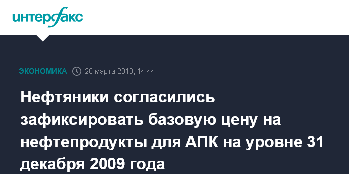 Москва. 20 марта. INTERFAX.RU - Все крупнейшие российские нефтяные компании поддержали предложение главы правительства РФ Владимира Путина зафиксировать в качестве базовой расчетной цены на нефтепродукты для сельхозпроизводителей оптовую цену, сложившуюся на 31 декабря 2009 года.