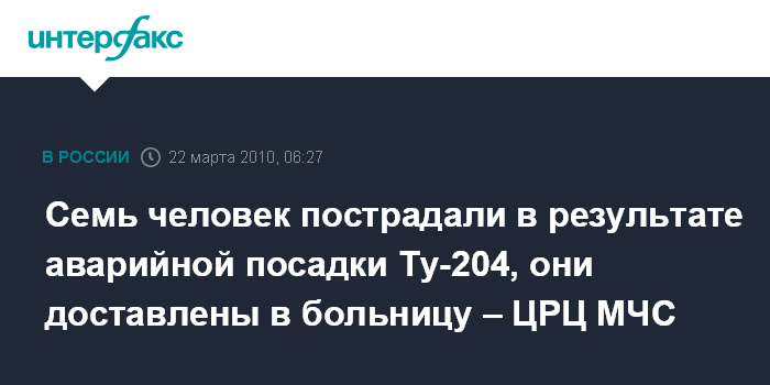 Москва. 22 марта. INTERFAX.RU - По уточненной информации, семь человек пострадали при аварийной посадке самолета Ту-204 в аэропорту "Домодедово".