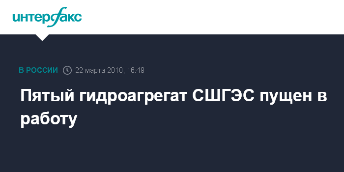 Москва. 22 марта. INTERFAX.RU – Пятый гидроагрегат Саяно-Шушенской ГЭС (СШГЭС) пущен в работу, передал корреспондент "Интерфакса" с церемонии пуска.