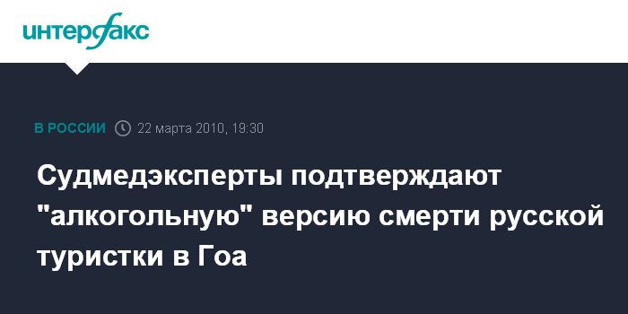 Дели. 22 марта. INTERFAX.RU - Результаты судмедэкспертизы, полученные индийской полицией, подкрепляют первоначальную версию о том, что российская туристка Елена Величко, обнаруженная мертвой в одном из отелей в Гоа, стала жертвой чрезмерного употребления алкоголя.