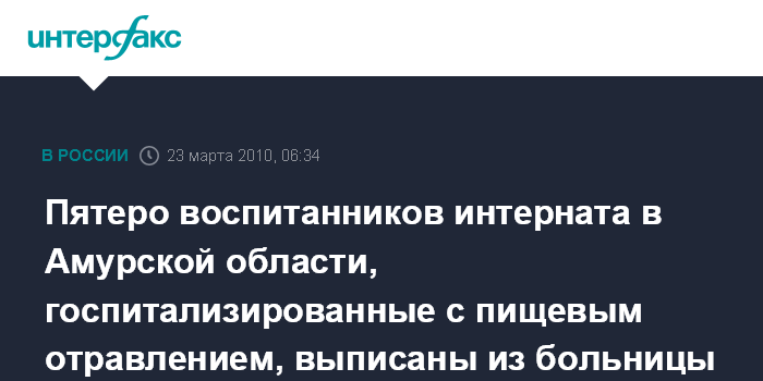 Хабаровск. 23 марта. ИНТЕРФАКС-ДАЛЬНИЙ ВОСТОК - В Амурской области, пострадавшие от пищевого отравления дети школы-интерната N5 в поселке Новобурейский, идут на поправку, сообщили агентству "Интерфакс - Дальний Восток" в областном министерстве здравоохранения.