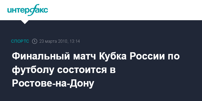 Москва. 23 марта. INTERFAX.RU – В Доме футбола в понедельник состоялось заседание бюро исполкома Российского футбольного союза (РФС), на котором было принято решение о проведении финального матча Кубка России 2009-2010 гг. в Ростове-на-Дону, сообщает официальный сайт РФС. В целях популяризации футбола в регионах были внесены соответствующие изменения в регламент Кубка России по футболу. Финальный матч Кубка России среди женщин 2010 г. будет проведен 31 октября в Краснодаре. Также было принято решение о проведение ежегодной Конференции Российского футбольного союза 17 мая в Ростове-на-Дону.