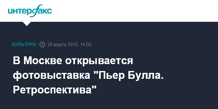 Москва. 24 марта. INTERFAX.RU – Фотовыставка "Пьер Булла. Ретроспектива" откроется в Московском музее современного искусства 25 марта, сообщили interfax.ru пресс-службе музея. Выставка, организованная "Московским домом фотографии", пройдет в рамках международного фестиваля "Фотобиеннале 2010".