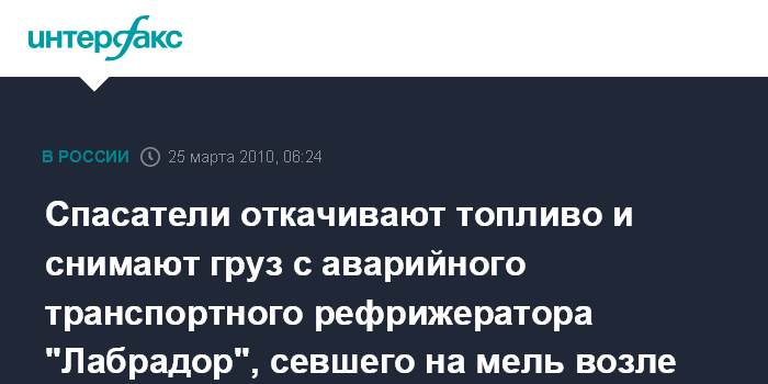 Южно-Сахалинск. 25 марта. ИНТЕРФАКС-ДАЛЬНИЙ ВОСТОК - С аварийного транспортного рефрижератора (ТР) "Лабрадор", севшего на мель возле о. Итуруп, спасатели снимают топливо для предотвращения его разлива.
