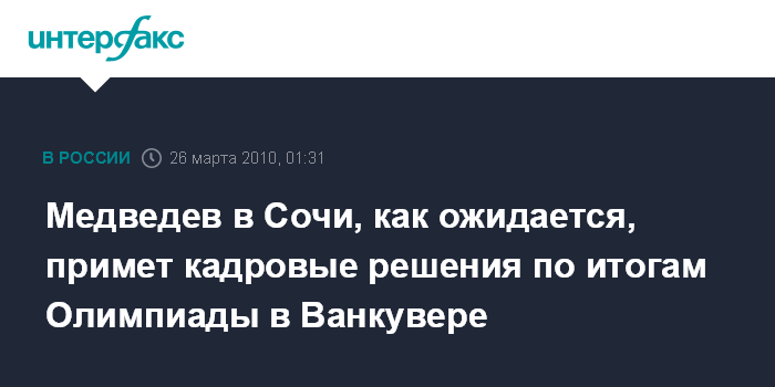 Медведев в Сочи, как ожидается, примет кадровые решения по итогам Олимпиады в Ванкувере