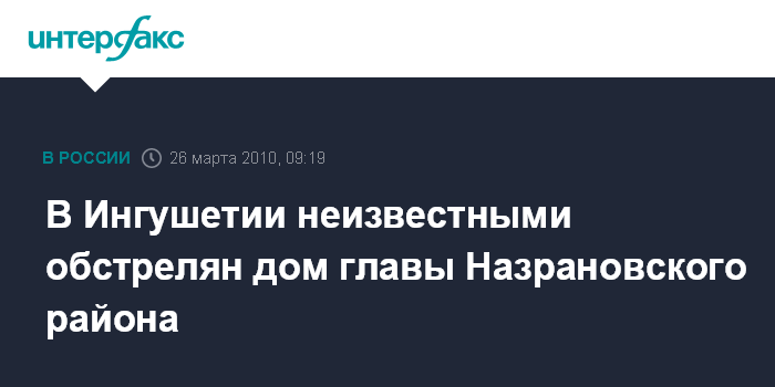 Москва. 26 марта. INTERFAX.RU - Дом главы администрации Назрановского района Ингушетии Багаудина Муцольгова обстрелян неизвестными из автоматического оружия. "Около 23:00 неизвестные на автомобиле ВАЗ-2107 подъехали к домовладению в Назрани, в котором проживает глава администрации Назрановского района Багаудин Муцольгов, и внезапно открыли огонь по дому чиновника, а также по дому его брата. В результате обстрела жертв и пострадавших нет", - сообщили агентству "Интерфакс" в правоохранительных органах Назрановского района Ингушетии. Там отметили, что на месте происшествия работает оперативно- следственная группа, обстоятельства нападения на домовладение главы районной администрации устанавливаются.