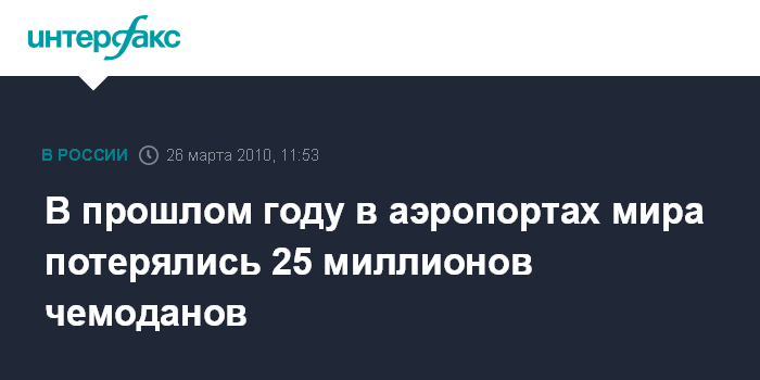 Москва. 26 марта. INTERFAX.RU - В аэропортах мира в 2009 г. были утеряны 25 млн. чемоданов и сумок, что обошлось авиакомпаниям в общей сложности в $2,5 млрд., сообщает "Немецкая волна" (Deutsche Welle).