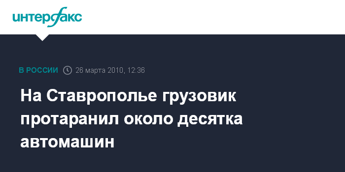 Москва. 26 марта. INTERFAX.RU - На 372 километре трассы "Кавказ" в Ставропольском крае у грузовика МАЗ, который двигался со стороны Нальчика, на спуске отказали тормоза, и он врезался в колонну автомобилей. Пресс-служба ОГИБДД УВД по Кавминводам сообщает, что инцидент произошел в минувший четверг около 16:00 мск. Жертв и пострадавших нет. "В момент, когда грузовик подъезжал к пешеходному переходу в районе рынка "21 век", на котором образовалась небольшая пробка, у него вышли из строя тормоза. Возможности для маневра у водителя не было, поэтому он врезался в колонну из девяти автомобилей", - говорится в сообщении.
