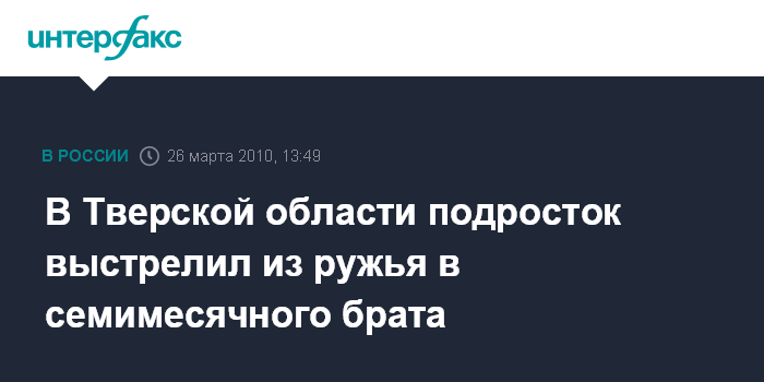 Москва. 26 марта. INTERFAX.RU - В реанимацию Тверской областной клинической больницы с тяжелым огнестрельным ранением головы доставлен семимесячный мальчик, сообщили в пятницу "Интерфаксу" в ОВД Рамешковского района Тверской области. "По предварительным данным, ребенка ранил собственный брат. Пятнадцатилетний подросток играл дома с заряженным пневматическим ружьем ИЖ-60 калибра 4,5 мм, которое случайно выстрелило. Пуля попала прямо в голову его есмимесячного брата", - рассказал собеседник агентства. Он уточнил, что несчастный случай произошел накануне вечером в поселке Рамешки Тверской области. Раненого ребенка доставили сначала в местную больницу, а в пятницу утром перевезли в Тверь. Состояние здоровья младенца врачи оценивают как крайне тяжелое. По факту случившегося проводится проверка.