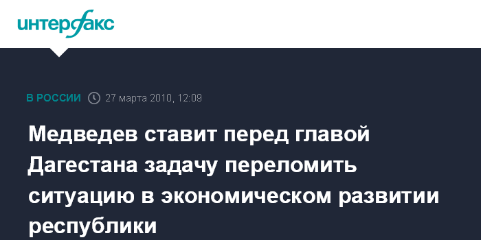 Сочи. 27 марта. INTERFAX.RU - Президент России Дмитрий Медведев считает необходимым, чтобы в Дагестане была составлена "дорожная карта" развития республики. На встрече с новым президентом Дагестана Магомедсаламом Магомедовым глава государства подчеркнул, что нормализация ситуации в Дагестане должна происходить не только и не столько в сфере безопасности, сколько в экономическом плане. Президент отметил, что в числе сложнейших задач - борьба с безработицей, реализация крупных программ, противодействие коррупции.