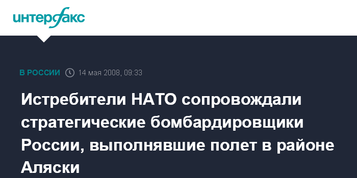 "Полет был выполнен с дозаправкой топлива в воздухе в районе Тикси. В районе Аляски в ходе воздушного патрулирования самолеты дальней авиации сопровождались истребителями НАТО", - сообщил Дробышевский. По его словам, все полеты самолетов ВВС России выполняются в строгом соответствии с международными правилами использования воздушного пространства над нейтральными водами. "При этом воздушные границы других государств не нарушаются", - сказал Дробышевский.