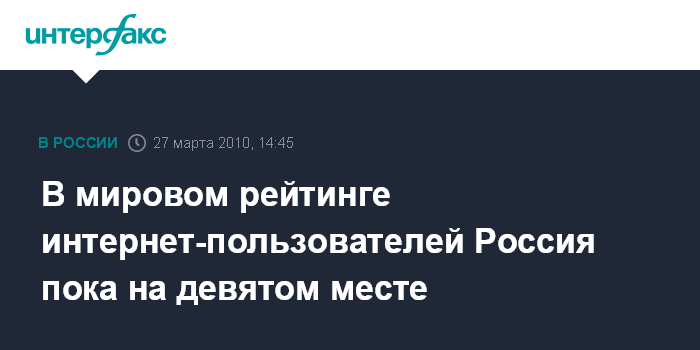 Между тем в мировом рейтинге интернет-пользователей Россия занимает девятое место. Лидирующую позицию в первой десятке зарубежных стран занимает Австралия, где 80% граждан пользуются всемирной паутиной, сообщает ФОМ со ссылкой на данные Internet World Stats. При этом российские пользователи всемирной сети составляют примерно 10% всех европейских интернет-пользователей. В основу данных ФОМ легли объединенные данные регулярных опросов, проведенных в течение сезона (зима 2009/2010). Всего было опрошено 24 тыс. респондентов старше 18 лет.