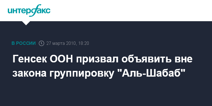 Лондон. 27 марта. INTERFAX.RU - Генеральный секретарь ООН Пан Ги Мун обратился к участникам Лиги арабских государств, собравшимся на конференции в Ливии, с призывом объявить вне закона исламистскую группировку "Аль-Шабаб", сообщает в субботу британская телерадиокорпорация Би-Би-Си. Боевики-исламисты из "Аль-Шабаб" контролируют большую часть Сомали.