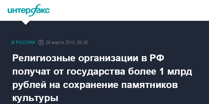 Москва. 28 марта. ИНТЕРФАКС - Государство выделяет серьезные средства, чтобы помочь религиозным организациям поддерживать памятники культуры, заявил руководитель Федеральной службы РФ по надзору за соблюдением законодательства в области охраны культурного наследия (Росохранкультура) Александр Кибовский.