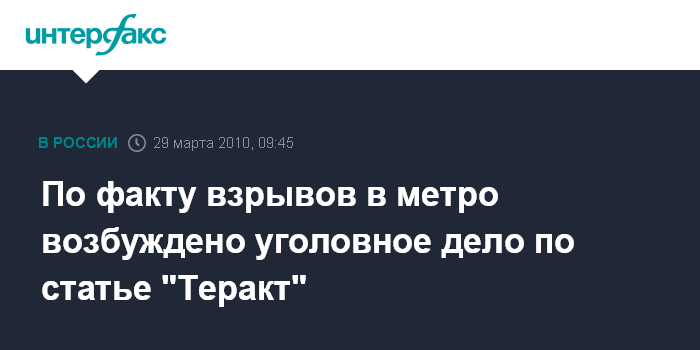 Как сообщил официальный представитель СКП Владимир Маркин, в понедельник с интервалом менее часа на станциях московского метрополитена "Лубянка" и "Парк культуры" произошло два мощных взрыва. Уголовное дело возбуждено по статье 205 УК РФ (теракт).
