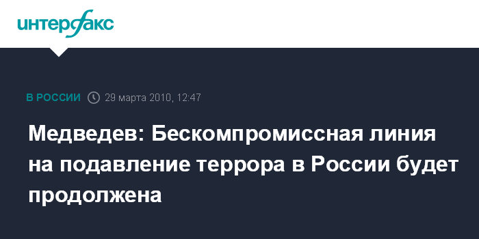 Москва. 29 марта. INTERFAX.RU - Президент РФ Дмитрий Медведев заявил, что руководство России продолжит жесткую линию на подавление терроризма.