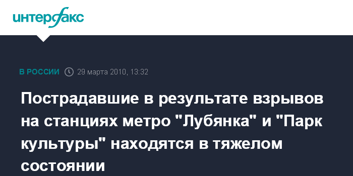 Москва. 29 марта. INTERFAX.RU - Медики московских больниц констатируют, что пострадавшие в результате взрывов на станциях метро "Лубянка" и "Парк культуры" находятся в тяжелом состоянии.