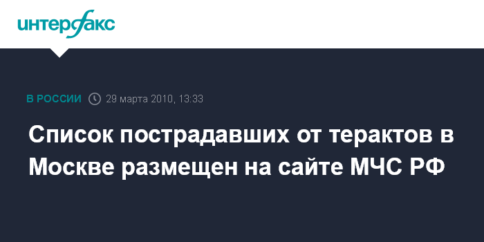 Москва. 29 марта. INTERFAX.RU - МЧС России опубликовало списки пострадавших в результате двух терактов, прогремевших в понедельник утром в Московском метрополитене.