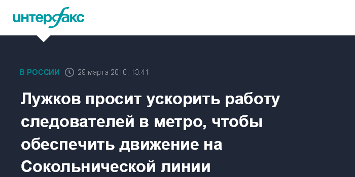 Москва. 29 марта. INTERFAX.RU - Мэр Москвы Юрий Лужков обратился с просьбой к следственным органам побыстрее завершить работу на местах взрывов в Московском метро, чтобы запустить работу метрополитена в нормальном режиме.