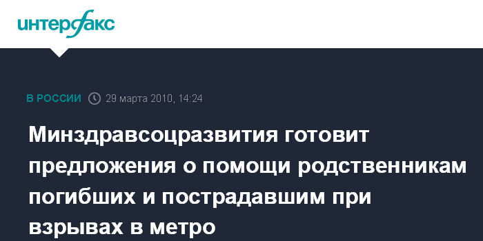 По ее словам, Минздравсоцразвития совместно с МЧС и правительством Москвы подготовили проект распоряжения правительства о выделении помощи родственникам погибших и пострадавшим в терактах в московском метро.