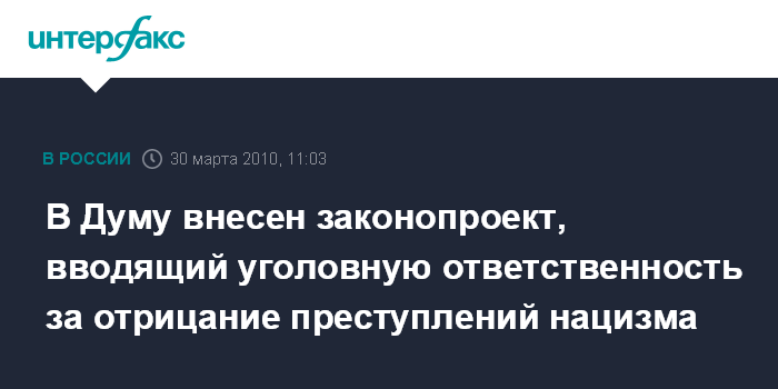 Москва. 30 марта. INTERFAX.RU - В Госдуму внесена обновленная редакция законопроекта об ответственности за одобрение или отрицание преступлений нацизма.